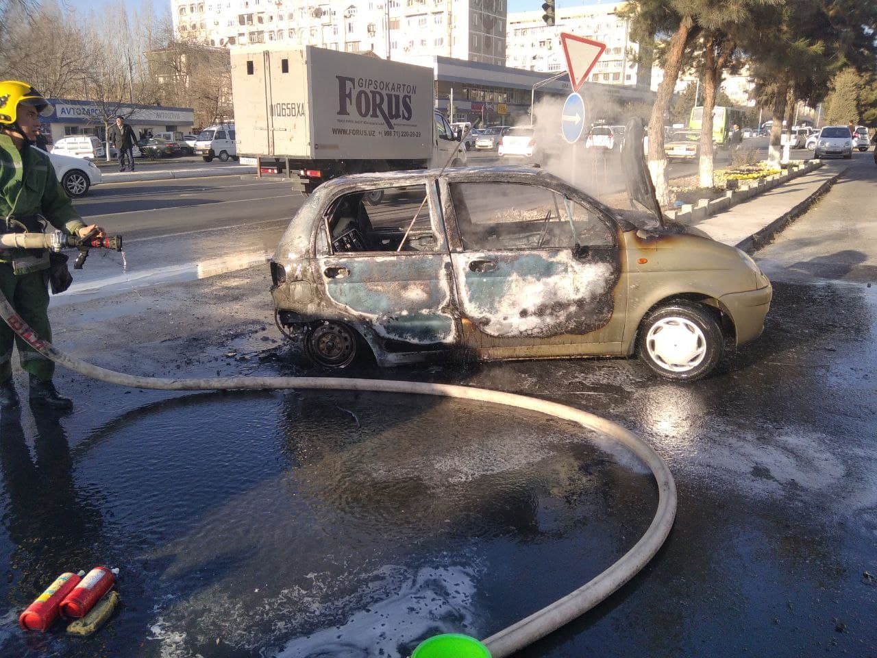 Joriy yilning 1-dekabr kuni soat 09:00 larda Toshkent shahar, Olmazor tumani, Beruniy ko‘chasida haydovchi, 1957-yilda tug‘ilgan O.Z. "Matiz" rusumli avtomobilda harakatlanayotib, "Registon" to‘yxonasi ro‘parasiga yetgan vaqtda transport vositasining dvigatel qismida yong‘in yuzaga kelgan.