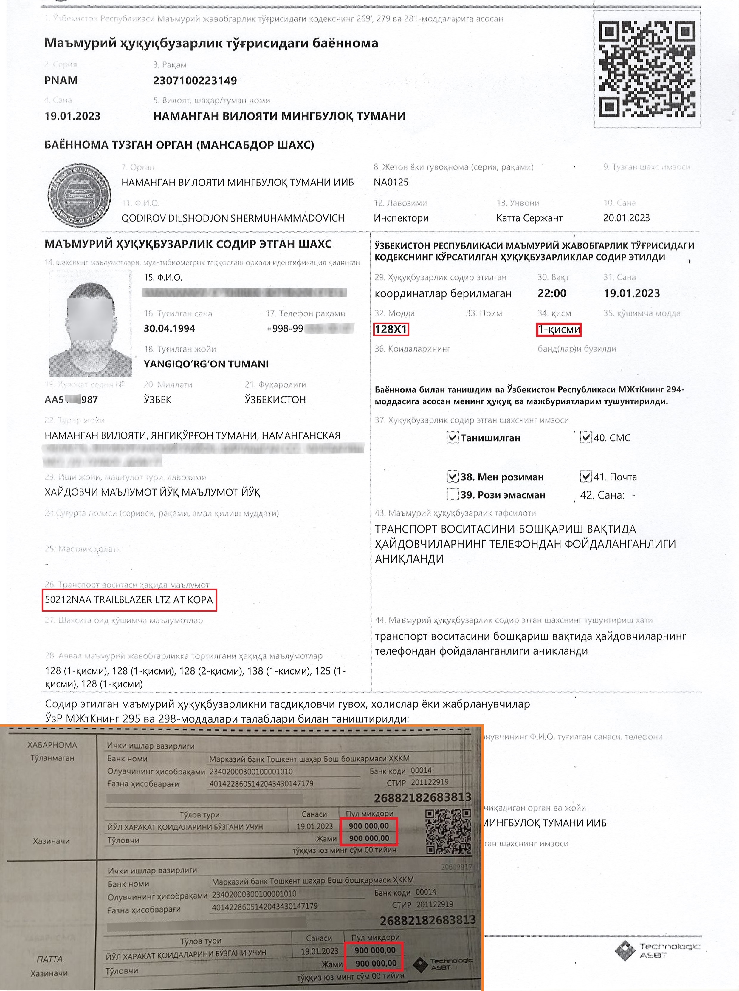 “Trailblazer” rusumli, 50212NAA davlat raqam belgili avtomobil haydovchisiga chora koʻrilg...