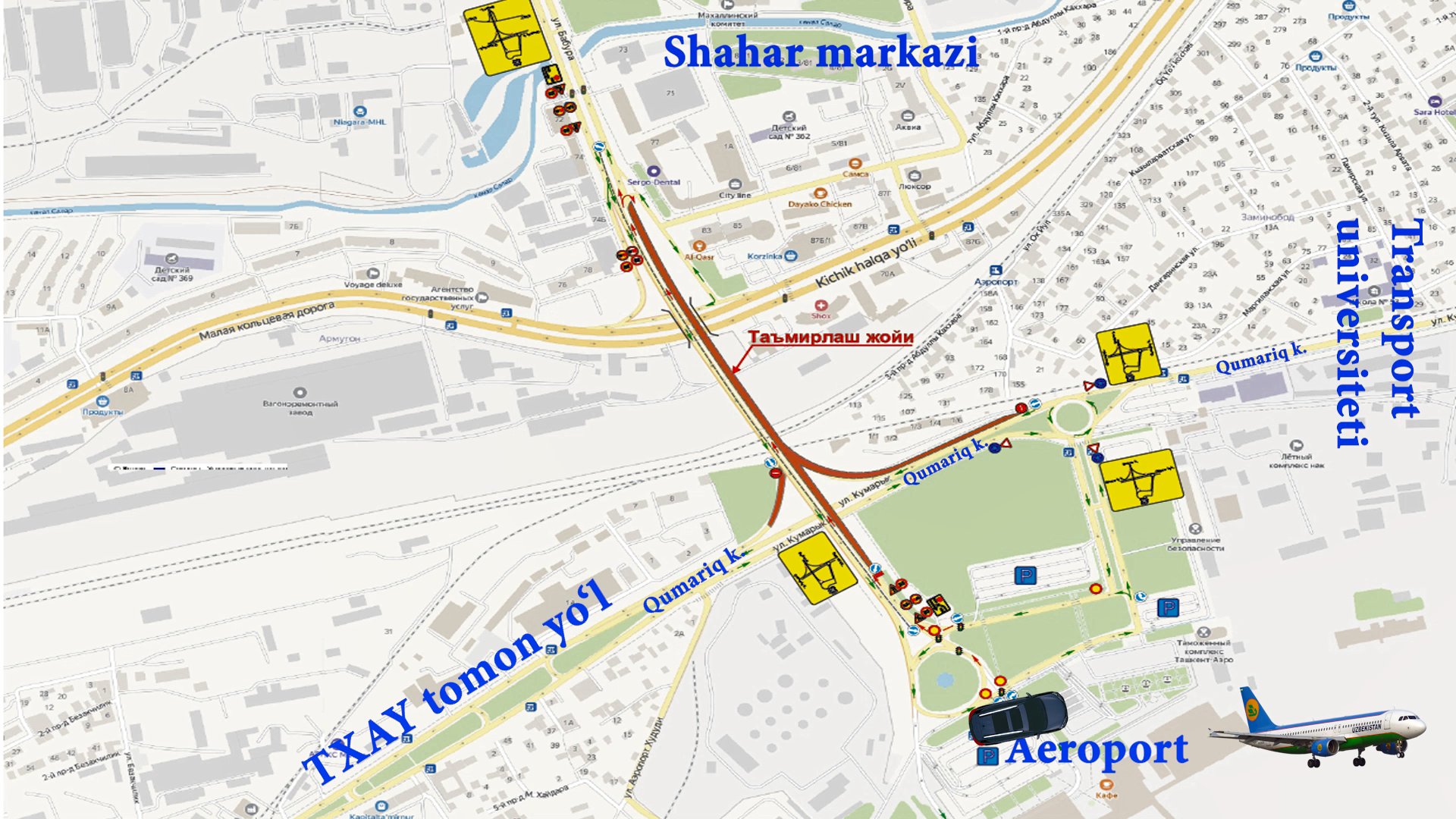 Toshkent xalqaro aeroportiga olib boruvchi koʻprik taʼmirlanmoqda. Harakatlanish tartibi e...