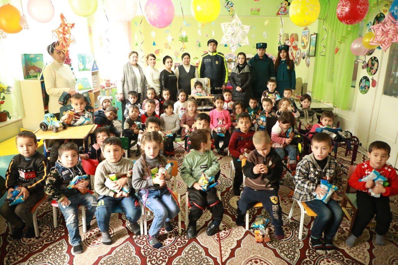 Наманган вилояти ИИБ ЙҲХБ ходимлари Давлатобод тумани МТБга қарашли 57-сонли кўп тармоқли ихтисослаштирилган мактабгача таълим ташкилотида тарбияланаётган болажонлар ҳолидан хабар олишди. Ходимлар болалар ва тарбиячиларни байрам билан табриклаб, уларга ширинликлар ва байрам совғаларини улашдилар.