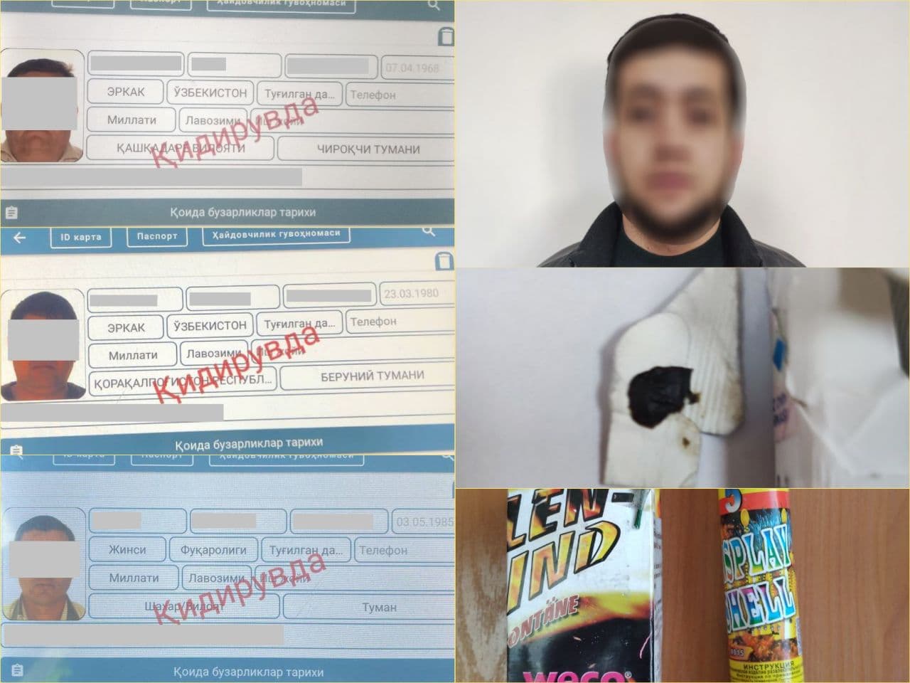 - 2021 йил 24 декабрь куни соат 17:00 ларда, Миробод туманида хизмат олиб бораётган ЙПХ ходимлари У.Ишанходжаев ва О.Масалиевлар томонидан, Қўйлиқ ота кўчасида пиёда равишда ҳаракатланиб келаётган, 1968 йилда туғилган Ў.А. тўхтатилиб, унинг маълумотлари планшет мосламаси ёрдамида махсус дастур орқали текширилганида фуқаро Ў.А. Ўзбекистон Республикаси Жиноят Кодексининг 168-моддаси 1-қисми билан айбланиб, 2021 йил 24 октябрь кунидан буён қидирувда эканлиги маълум бўлган.