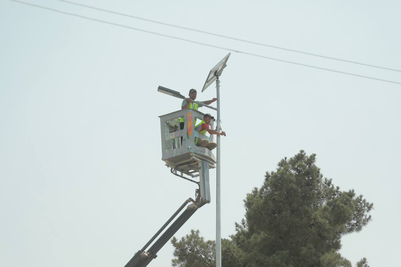 Шу билан бирга вилоятнинг Ангор ҳамда Музработ туманларида пиёдалар учун ташкил этилаётган тротуар ҳамда йўлни сунъий ёритувчи қуёш панелларида ишловчи замонавий ёритиш чироқлари ўрнатилиб фойдаланишга топширилди.