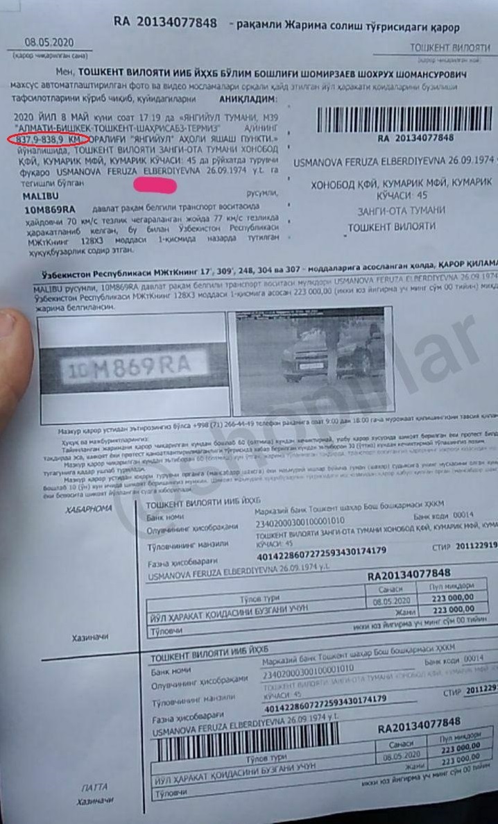 Текширув жараёнида, “Малибу” русумли, давлат рақам белгиси 10 М 869 RA бўлган транспорт воситаси жорий йилнинг 8 май куни М39 “Алмата-Бишкек-Тошкент-Шаҳрисабз-Термиз” автомобиль йўлининг 838 километрида, тезлик 70 км/соат қилиб белгиланган ҳудудда 77 км/соат тезлик билан ҳаракатланган вақтида “Нексия-3” русумли транспорт воситасига ўрнатилган, Германияда ишлаб чиқарилган махсус автоматлаштирилган фото ва видео қайд этиш мосламаси ёрдамида қоидабузарлик аниқланган.
