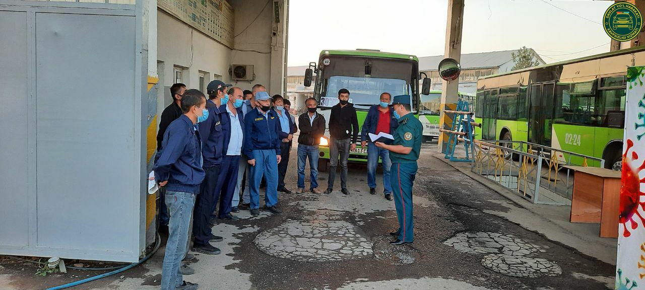 Тошкент шаҳар ИИББ ЙҲХБ Транспорт воситаларининг техник ҳолати устидан назоратни ташкил этиш бўлими ходимлари томонидан пойтахт ҳудудида жойлашган "Тошшаҳартрансхизмат" акциядорлик жамиятига қарашли 8 та автопаркларда йўналишсиз такси автомобиллари ва барча автобуслар йўналишга чиқишдан аввал карантин қоидалари асосида дезинфекция қилиниши юзасидан текширув ишлари ўтказилди.