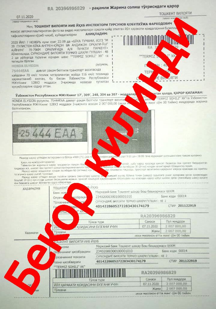 Бошқа манзилга юборилган жарималар бекор қилиниб, назоратчи масъулларга хизмат текшируви б...