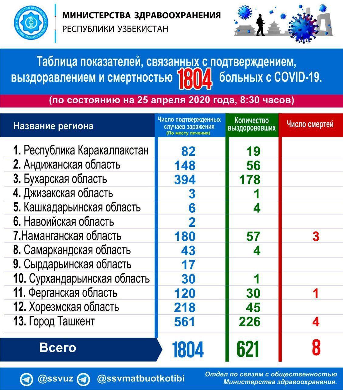 РЕСПУБЛИКАМИЗДА 2020 ЙИЛ 25 АПРЕЛЬ КУНИ СОАТ 10:00 ҲОЛАТИГА КЎРА КОРОНАВИРУС ПАНДЕМИЯСИ РА...