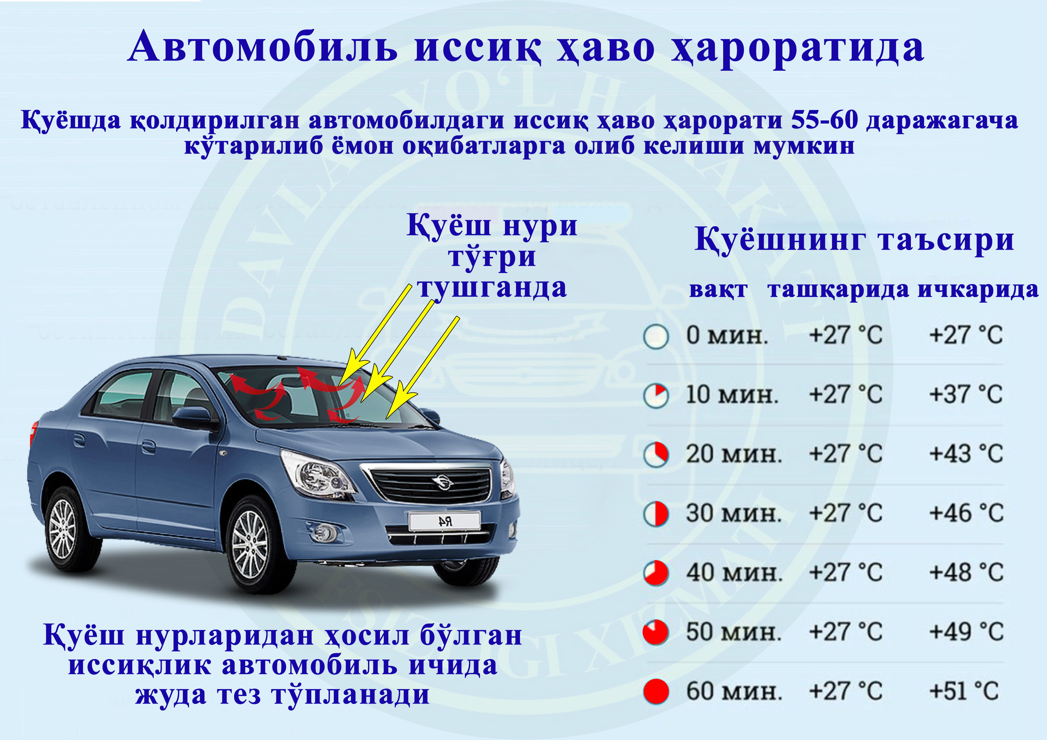 Қуёшда қолдирилган автомобилдаги иссиқ ҳаво ҳарорати 55-60 даражагача кўтарилиб ёмон оқиба...