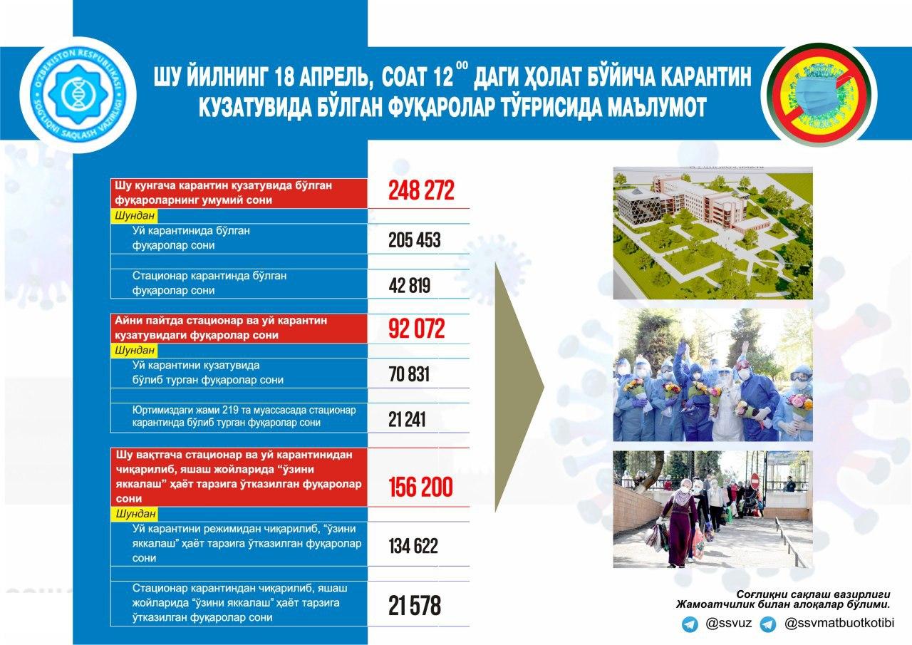 18 апрель 12:00га қадар карантин кузатувида бўлган фуқаролар тўғрисида маълумот