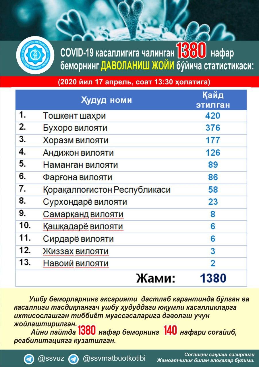 COVID-19 касаллигига чалинган 1380 нафар беморнинг даволаниш жойи бўйича маълумот