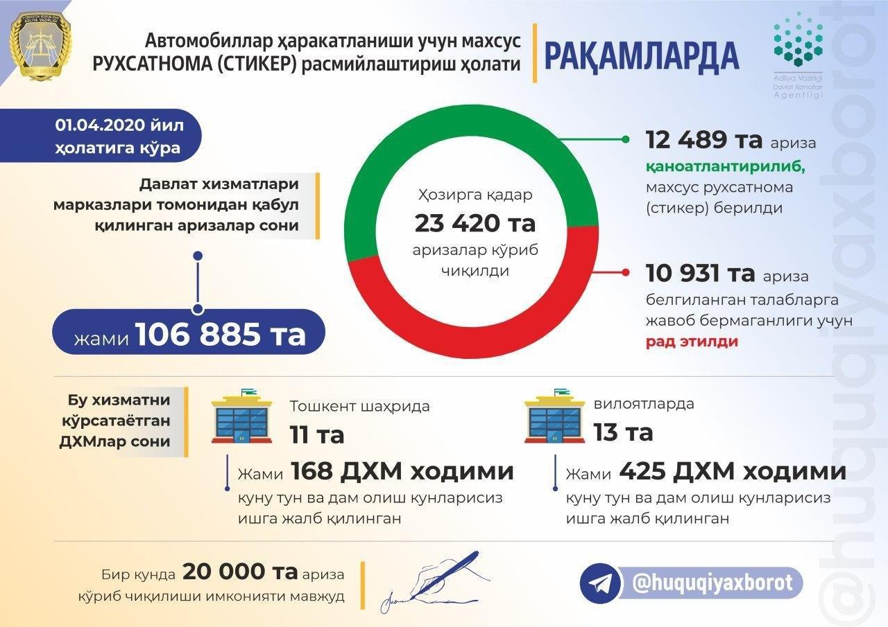 Автомобиллар ҳаракатланиши учун махсус рухсатнома (стикер) расмийлаштириш ҳолати рақамлард...