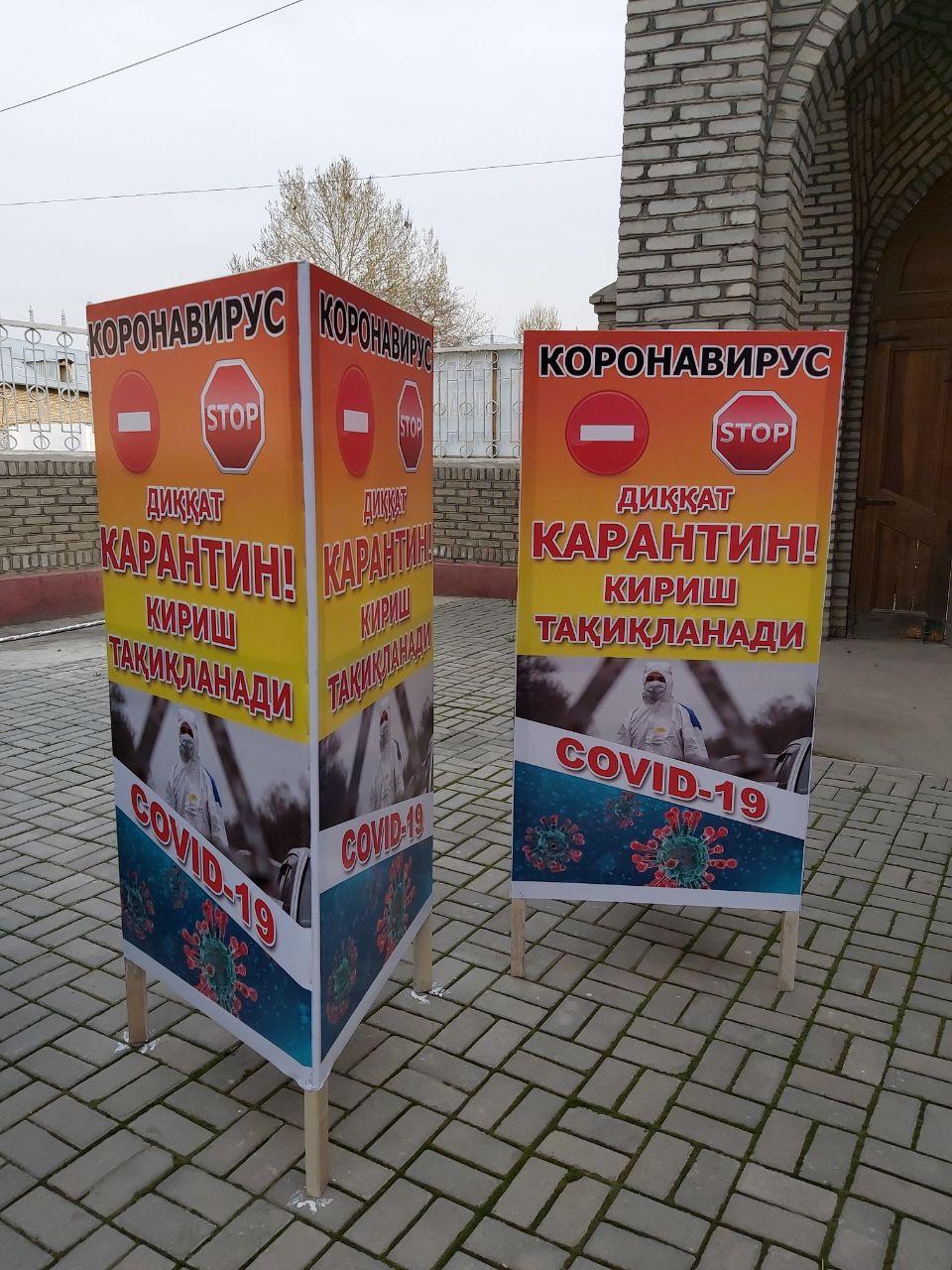 Андижон вилояти шаҳар ва туманларида ташкил этилган карантин постларида махсус баннерлар ў...